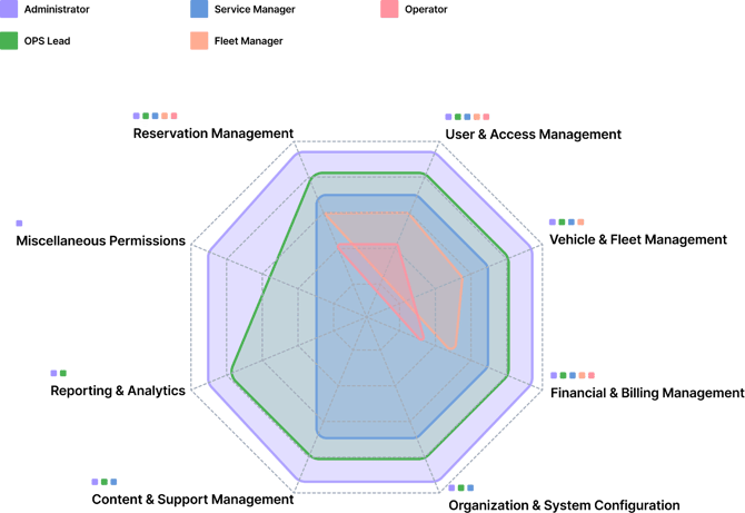 The Axes: Each axis extending from the center represents one of our permission categories (e.g., Reservation Management, Financial Management, etc.).